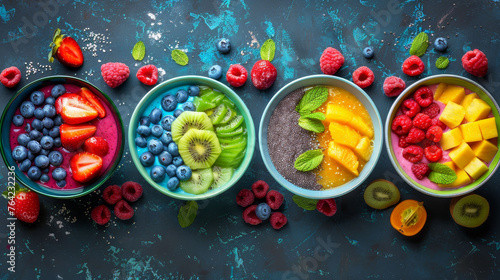 Colorful fruit smoothie bowls arranged in a gradient showcasing healthy eating