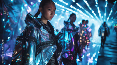 Futuristic fashion show with models in high-tech outfits on illuminated runway