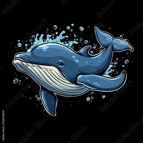 Cute hand-drawn blue whale sticker with white contour and smiling face