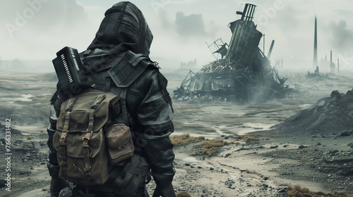 Lone survivor traversing a desolate post-apocalyptic landscape