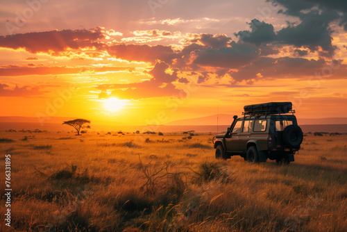 White campervan ready for travel at dusk or dawn
