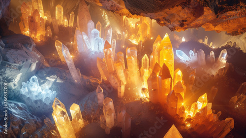 A group of explorers with torches traverses the majestic interiors of an ancient cave system