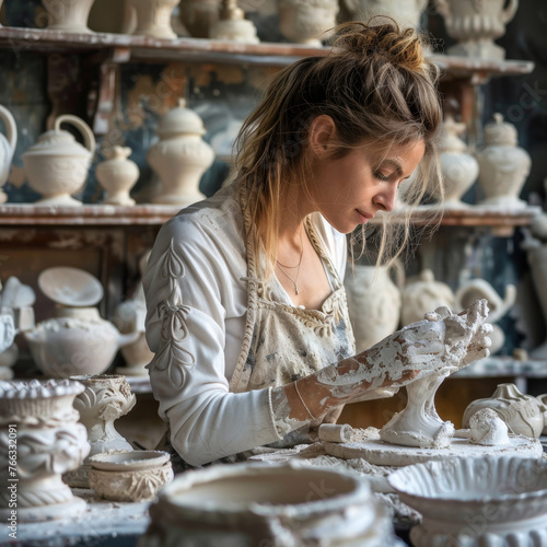 Artisan caucasian woman sculpting clay pottery in a rustic workshop