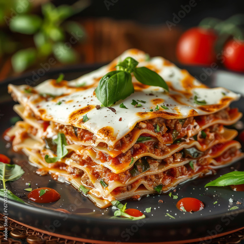 Top view of delicious homemade lasagna on a plate garnished with basil