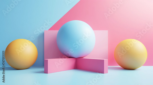Colorful abstract spheres on a soft yellow background with geometric arrangement