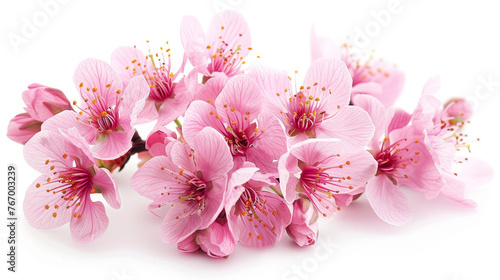 Bright pink cherry blossom flowers in full bloom on a branch against a white background