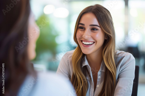 Smiling businesswoman in a professional setting having a conversation