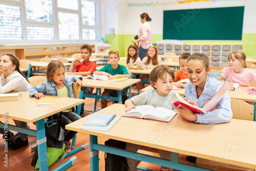 School teacher sitting with children in classroom