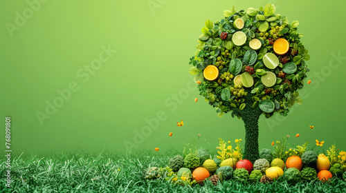 Conceptual tree with vibrant fruit and vegetable leaves on a green background