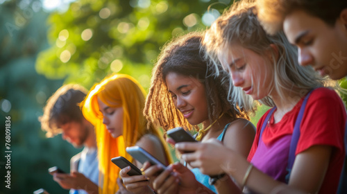 Teenagers with smartphones enjoying time together in a sunny park