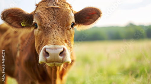 Close-up portrait of a brown cow in a sunny field with gentle eyes