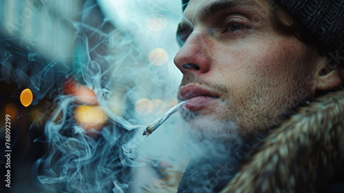 Close-up of a contemplative man smoking a cannabis joint in an urban setting