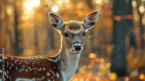 Adorable fawn standing in a sunlit European forest with soft golden light highlighting the natural beauty and innocence of wildlife in a serene outdoor setting