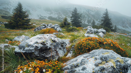 Panoramic landscape view of alpine meadows with mountain backdrop and clear sky