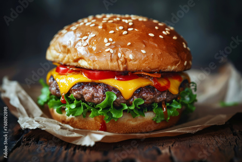 Tasty classic cheeseburger, dark background