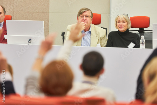 Professional answering during business conference in convention center