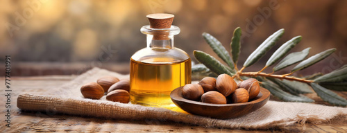 Argan oil bottle rests by its source, the argan nut, on textured fabric. This golden elixir, treasured for its benefits, is crafted from kernels within these humble seeds. #777408991