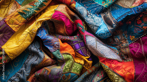Colorful patchwork quilt in a close-up view displaying a variety of patterns and stitches