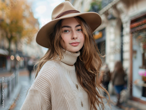 Fashionable woman in a chic hat and sweater enjoying a city street