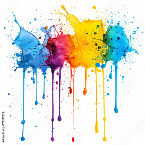 Vibrant explosion of multicolored paint splashes on a white background, showcasing dynamic fluid motion.