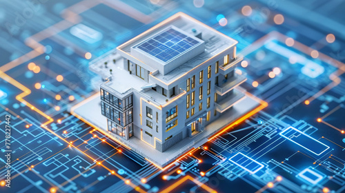 Futuristic smart building concept with integrated technology on a digital interface