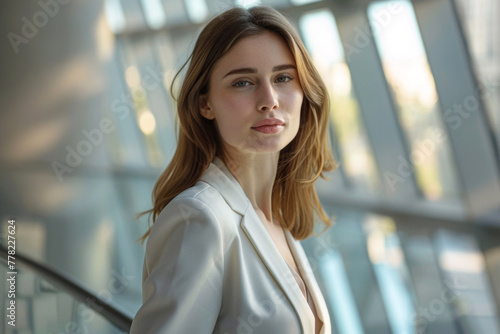 Smiling young businesswoman in casual office attire standing in a modern workspace