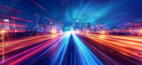 High-speed highway with city buildings in the background at night with light trails