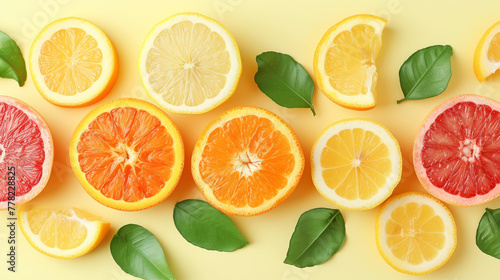 Flat lay of winter fruits like oranges, pomegranate and grapefruit