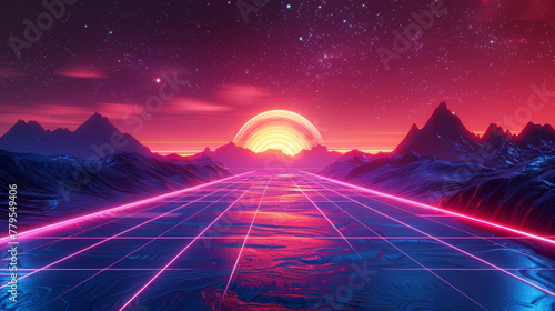 Vibrant 80s inspired futuristic landscape with neon colors and retro digital art design