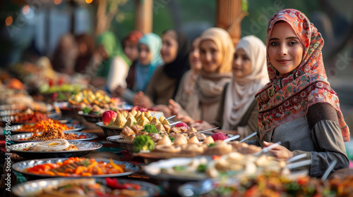 Muslim women gathering for Iftar during Ramadan with festive dishes