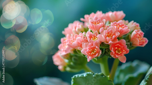 Vibrant Kalanchoe blossfeldiana blooms with lush green foliage in soft focus background