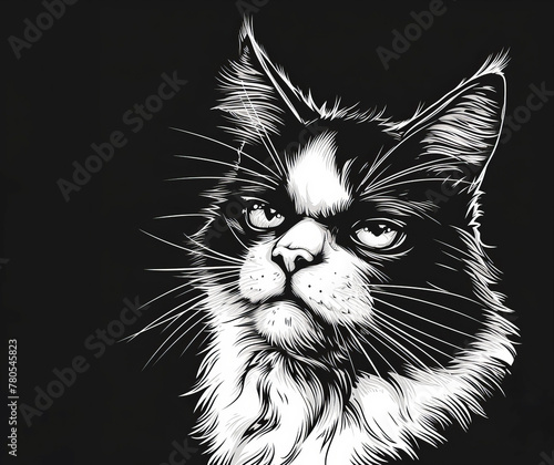 Monochrome illustration of a cat with a squished face on a black background