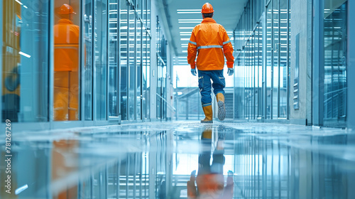 Office building cleaner in hi-vis jacket maintaining cleanliness