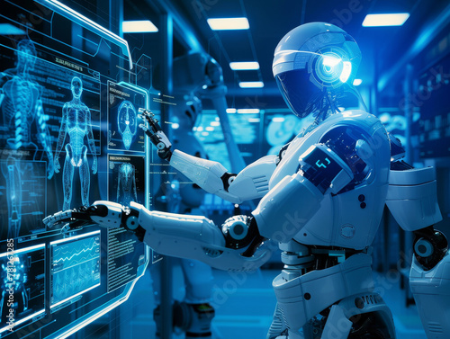 Futuristic robotic surgeon analyzing patient data in a high-tech operating room