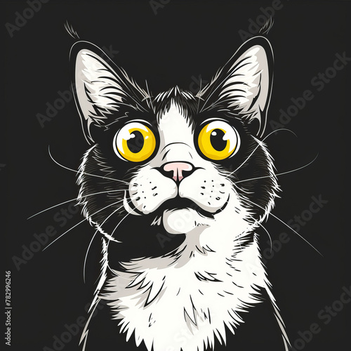 Humorous illustration of a cross-eyed cat with a whimsical grin on a dark background