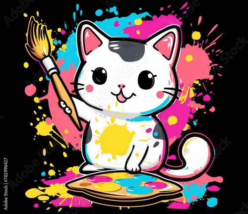 Cute kawaii cat with big eyes holding a coffee cup on dark background