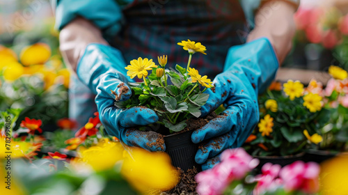 Gardener at work, nurturing vibrant flowers in a sunny greenhouse
