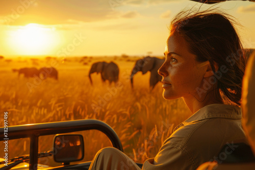 Serene woman enjoying tranquil sunset in a blooming meadow during golden hour