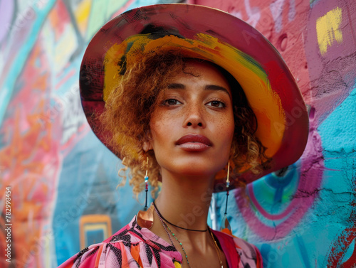 Fashionable black woman with curly hair posing against vibrant graffiti