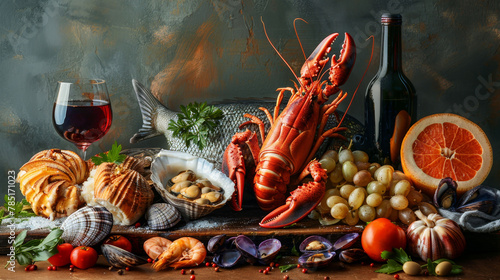 Lavish seafood spread with fresh lobster, fish, and shellfish with wine