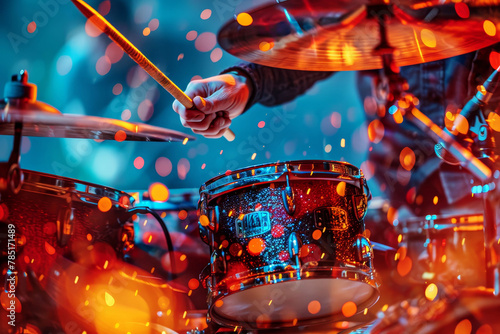 Dynamic drummer in action playing drums with a stick mid-strike in vibrant concert lighting