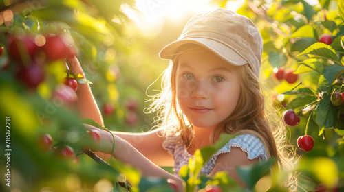 Young girl picking cherries in a sunlit orchard, vivid nature and childhood joy