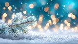 Snowy Pine Branch With Bokeh Lights On Blue Background For Winter Holiday Season And Christmas Celebrations Festive Atmosphere