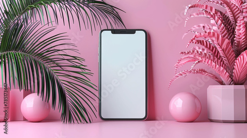 Stylish smartphone mockup with pink theme and tropical plants