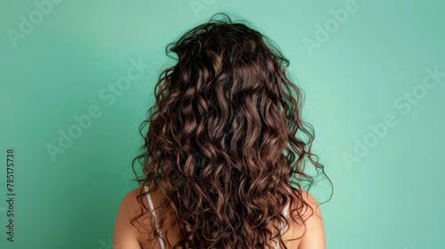 Unretouched photo of a young woman with luscious curly hair against a teal background