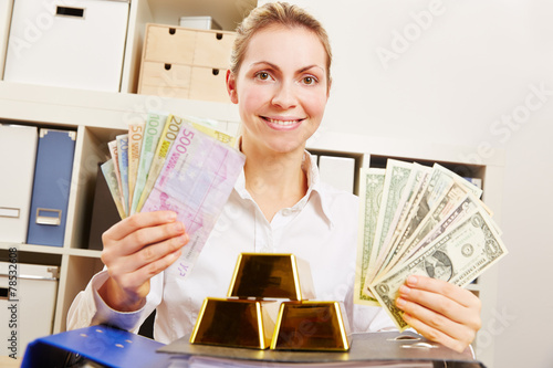 Frau mit Geld als Euro und Dollar und Gold
