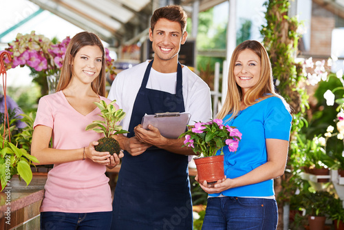 Mutter und Tochter mit Pflanze in Gärtnerei