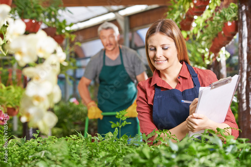 Gärtner Azubi mit Checkliste notiert eine Bestellung