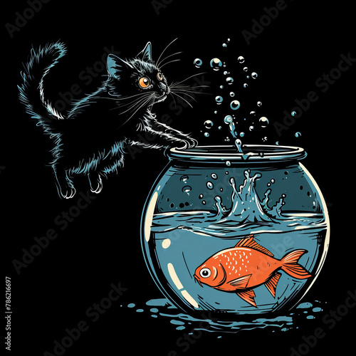 Playful cat trying to catch a startled fish in a fishbowl on a dark background