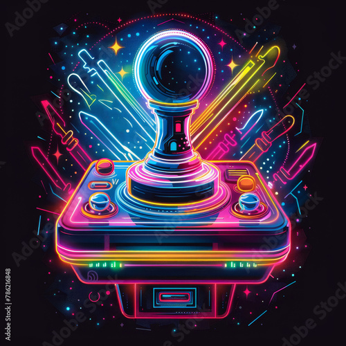 Retro arcade joystick embraced by neon lights and cosmic vibes